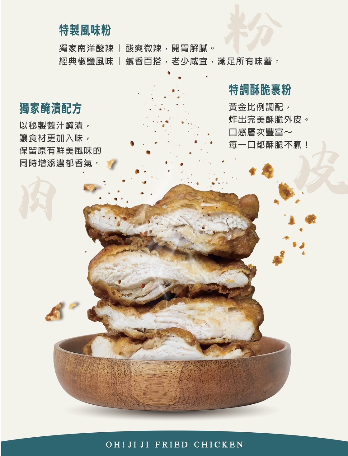 有別於傳統雞排,OH!JiJi 以南洋風味為靈感,結合獨家醃漬配方、酥脆卻不厚重的外皮與專屬風味粉,入口爽脆、香氣層次分明,卻清爽不膩。順口耐吃的風味,讓首次嘗鮮的顧客容易接受,也成功累積穩定回訪客群,逐漸成為學生族、上班族與家庭客群的熱門新選擇。