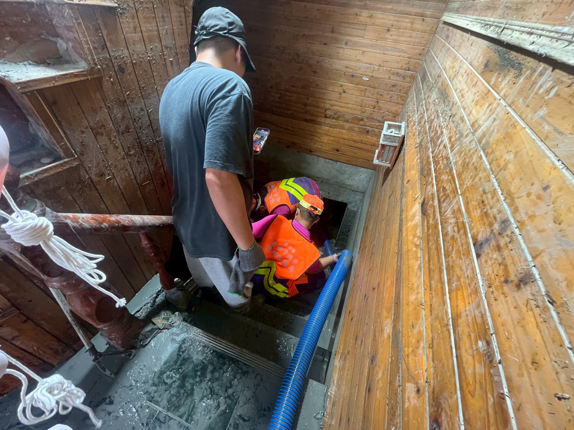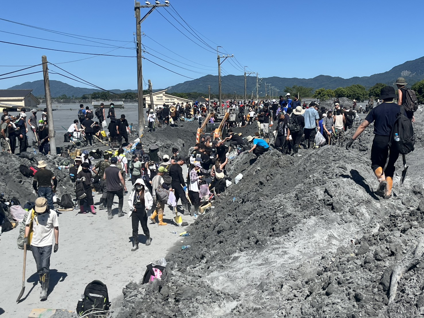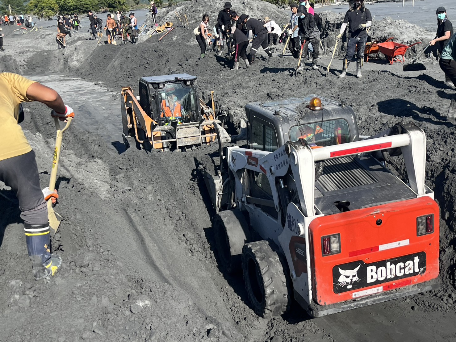 環保局表示,清溝車具備抽排積水與清除側溝淤泥的功能,山貓則能大幅提升大面積泥堆的清除效率。現場作業由邱源隆隊長率隊操作清溝車,採沖吸並用方式,迅速清理民宅地下室與校園廣場的淤泥;另一組由吳志明隊長調度山貓,在佛祖街一帶協助道路復原,成功剷除比車身還高的泥層,讓受困道路逐步恢復通行。