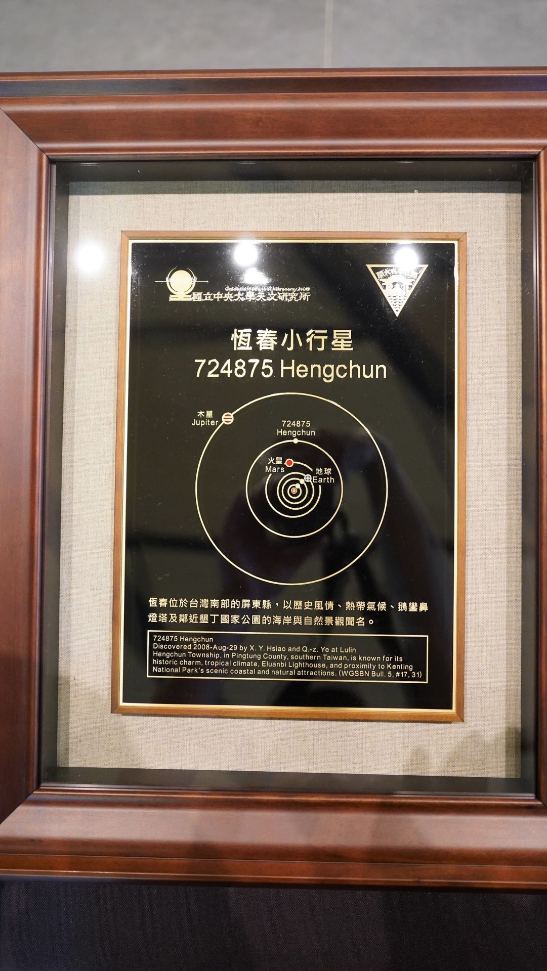發布會現場邀請國立中央大學副校長陳文逸率鹿林天文台團隊出席,並與「墾丁小行星」發現者蔡元生先生共同見證這場宇宙與土地交會的榮耀時刻。陳文逸副校長代表天文團隊致贈「HENGCHUN 恆春小行星」命名銘版,象徵恆春之名正式被刻入星圖;周縣長則回贈由恆春藝術家楊宗熏以在地木材創作的雕刻藝術品,寓意「星辰與大地的共鳴」。