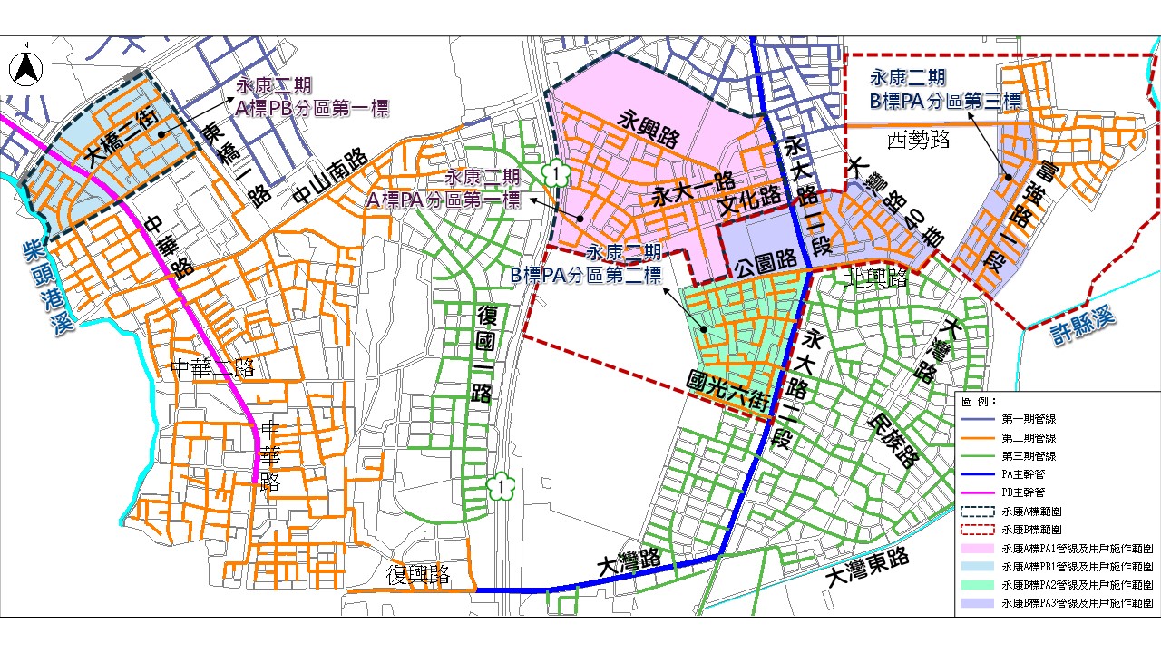 水利局表示,永康區污水下水道系統持續推動在建工程計四案,其中屬於永康PA分區第一標工程,範圍為中山高速公路以東、永平街以南、永大路二段以西、文化路以北,預計施工期程為540天,管線工程預計施作4,326公尺,用戶接管2,735戶;PB分區第一標工程範圍為柴頭港溪以東、縱貫鐵路以南、大橋重劃區以西、大橋一街以北,預計施工期程為540天,管線工程預計施作3,846公尺,用戶接管4,061戶;PA分區第二標工程範圍為永大路二段以西、公園路以南,大灣路942巷以東、國光六街以北區域,預計施工期程為560天,管線工程預計施作5,360公尺,用戶接管1,731戶;PA分區第三標工程範圍為文化路以西大灣重劃區區域以及北興街、富強路、西勢路所圍區域,預計施工期程為560天,管線工程預計施作5,301公尺,用戶接管1,850戶。