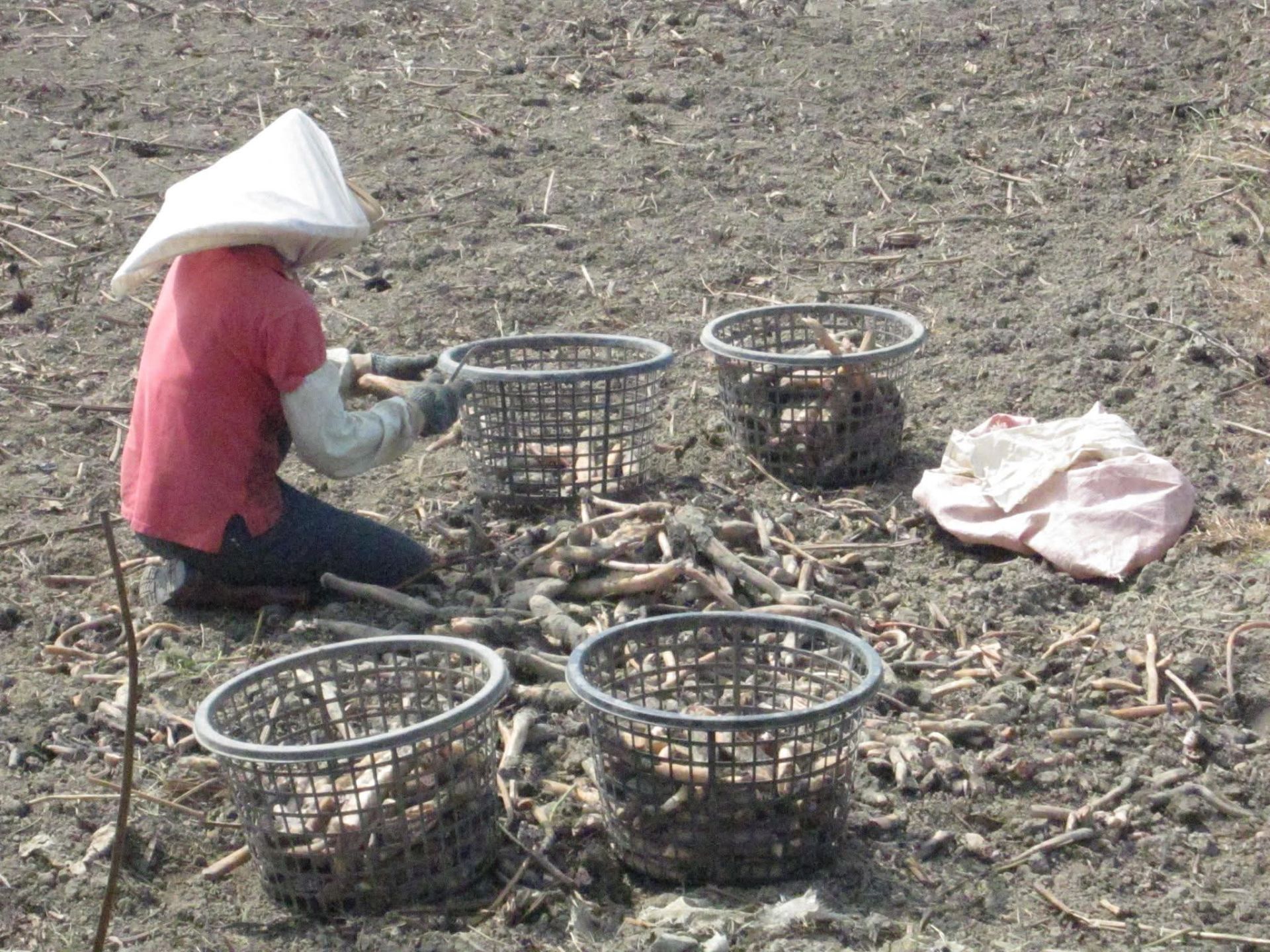 蓮子採收後,等整片蓮葉都枯萎了,蓮田的土也乾得不是泥濘地雙腳可踩踏了,耘土的小農機可挖掘蓮藕,農民就開始忙碌了,一塊一塊摘折放進畚箕裏,再裝進袋子裏,收購的生意人在蓮子下種時,就挨家挨戶談攏價格,何時來載也都抓準了時間。