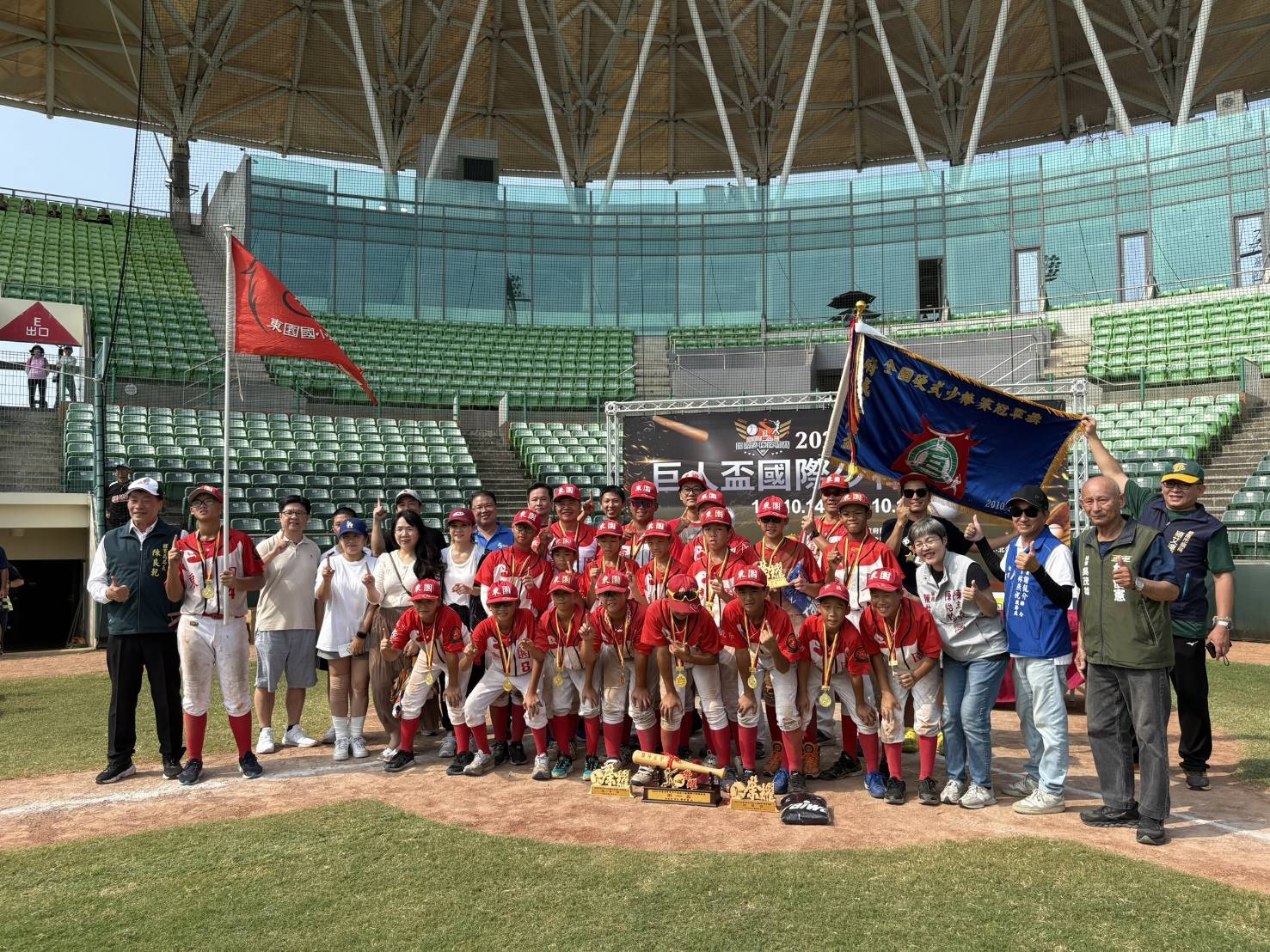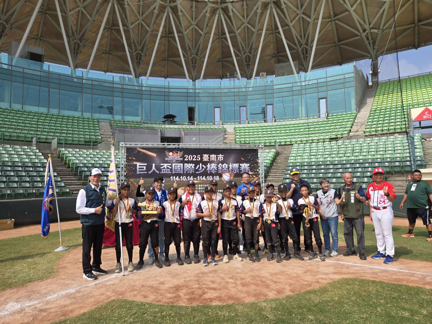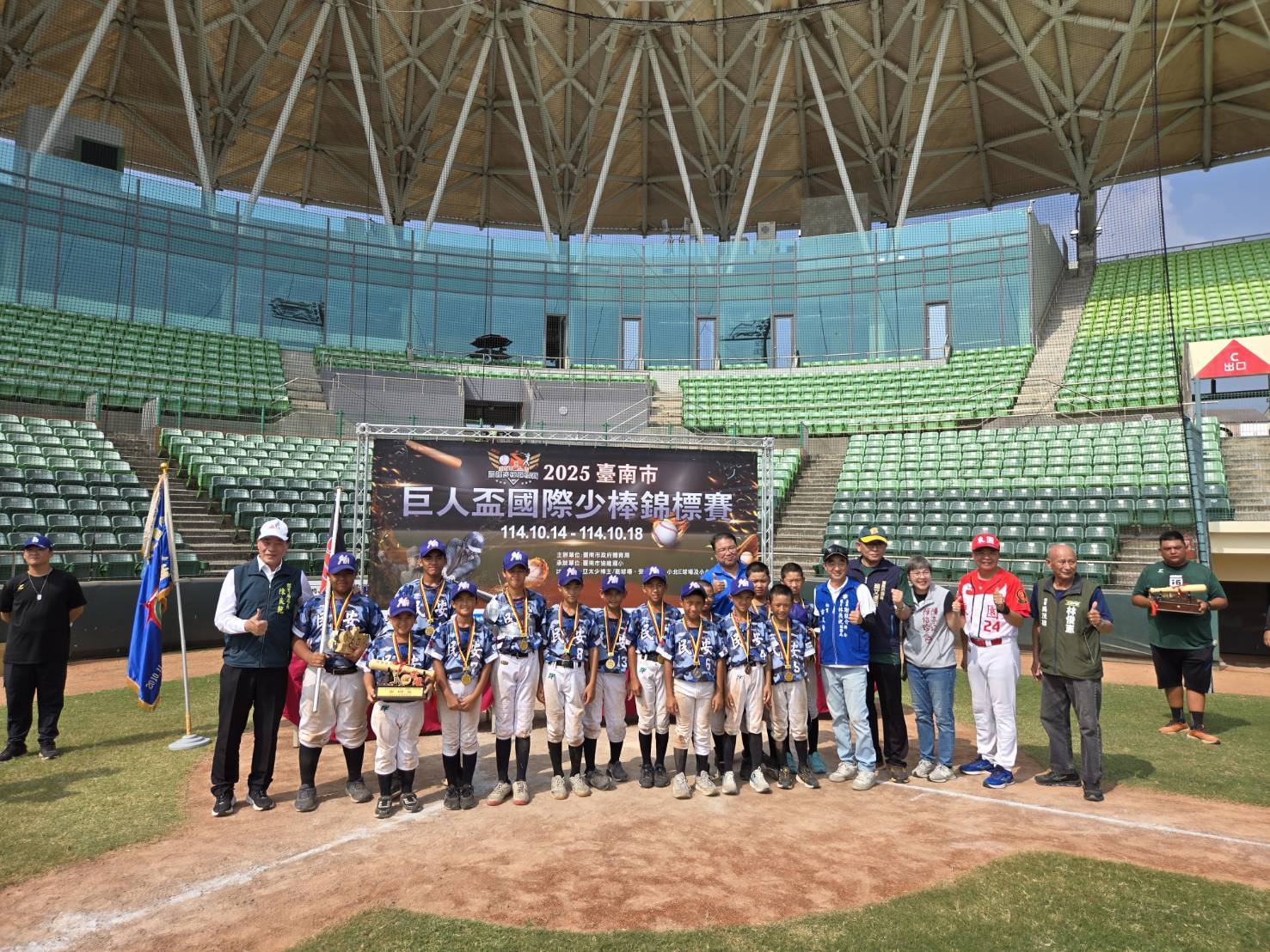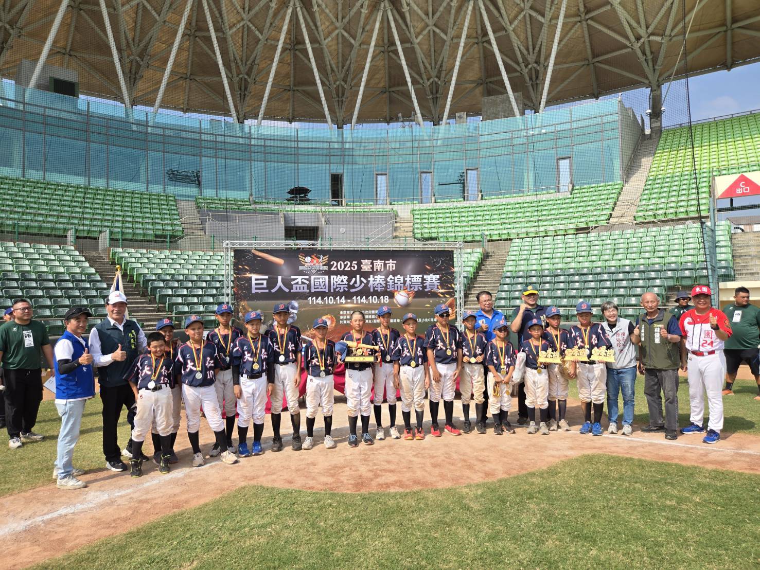 歷經五天熱血對決,2025臺南市第16屆巨人盃國際少棒錦標賽昨(18)日於亞太國際棒球訓練中心少棒主球場舉行閉幕典禮,由體育局陳良乾局長、穎艾達利議員、林俊憲立委秘書吳茂雄、陳亭妃立委秘書陳怡伊、謝龍介立委秘書方文賢及協進國小校長陳智揚出席閉幕典禮,為這場棒球盛會劃下完美句點。本屆賽事自10月14日至18日舉行,共有40支少棒勁旅齊聚臺南,包括從韓國遠道而來的代表隊與臺灣各地少棒小將同場競技,以球會友,展現棒球運動無國界的熱情與魅力。最終由臺北東園國小勇奪冠軍,臺中大仁國小榮獲亞軍,臺東豐田國小及新北民安國小則分別拿下季軍與殿軍之殊榮。