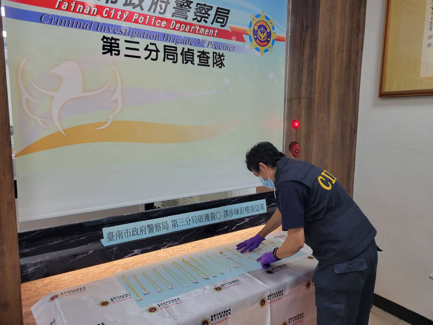 臺南市政府警察局第三分局於10月27日17時許接獲報案,安南區安和路某銀樓發生強盜案件,一名身穿深色衣褲、戴全罩式安全帽的男子闖入店內,持鐵鎚與辣椒水威嚇店員後,砸破玻璃搶走黃金飾品一批隨即逃逸,警方獲報後立即成立專案小組積極查緝,於同日晚間23時拘捕黃姓犯嫌(男、36歲),6小時內迅速破案。