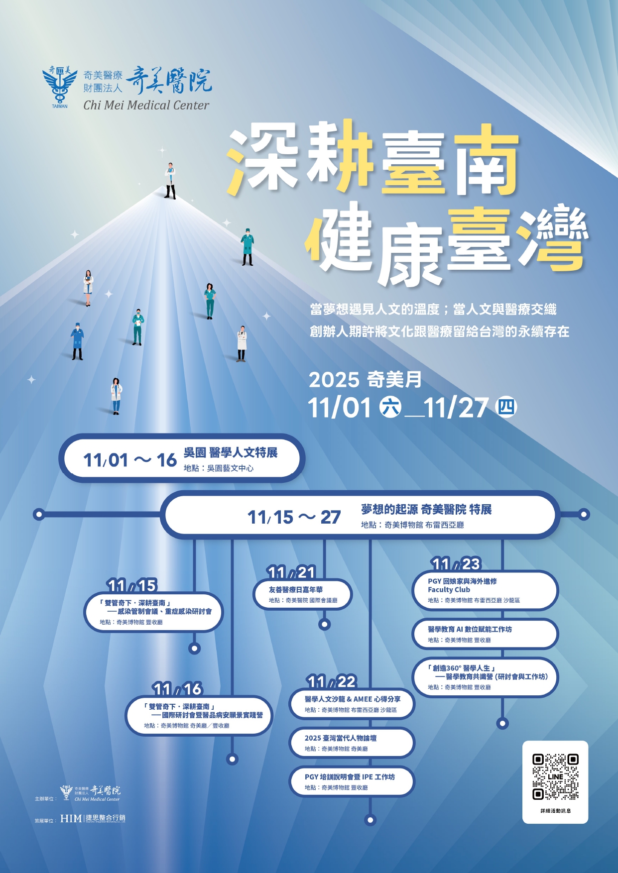 奇美醫療體系(永康奇美醫院、柳營奇美醫院、佳里奇美醫院)於今(114)年11月在奇美博物館、吳園及奇美醫院三處場域推出「奇美月-深耕臺南‧健康臺灣」整月系列活動,將醫療專業、醫學教育、醫品病安、人文藝術與社區生活緊密結合,落實「無牆醫院」理念,創造「群體健康價值」。此系列活動呼應衛生福利部「健康臺灣深耕計畫」的宗旨,以多元形式實踐「建構學習型照護聯盟、共創群體健康價值」的承諾。活動內容橫跨醫療專業、醫學人文、醫品病安、學術研討、醫學教育、數位賦能工作坊與社區健康推廣,充分展現奇美醫院的核心價值與創新。同時,活動呈現奇美醫院透過多元人才培育與智慧醫療科技來優化醫療工作條件與實現社會責任永續等重點,展現「深耕臺南、健康臺灣」的具體行動。