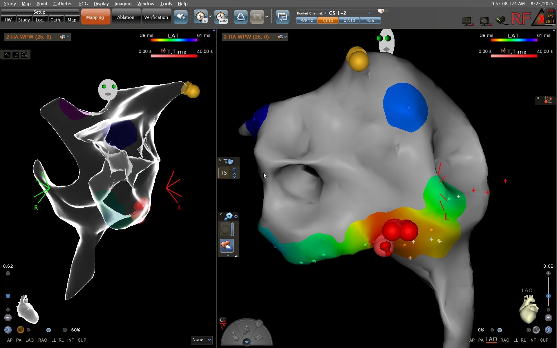 透過3D電生理定位系統,醫師能在立體模型中清楚辨識正常傳導路徑(黃點處)與副傳導路