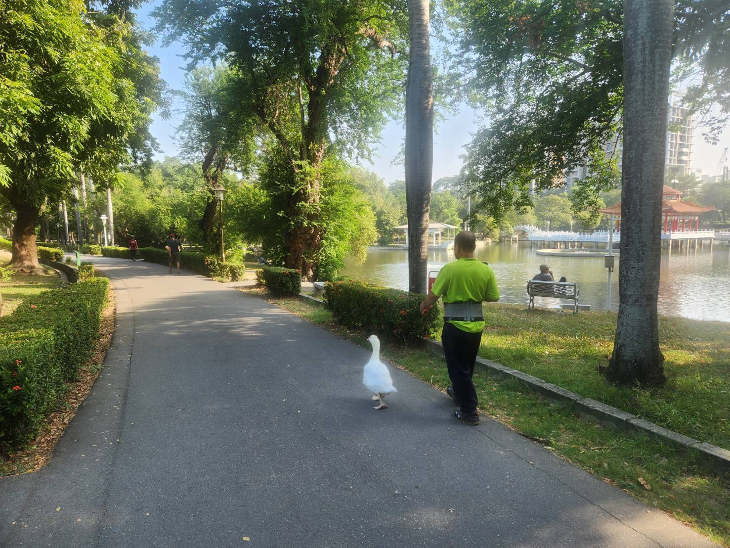 記者於本月初上午約八點多走進台南公園散步,看見一隻大白鵝昂首闊步,並走在阿伯前面,原以為白鵝是公園內無人飼養的,但阿伯一直跟在白鵝後面,加上在公園打掃女清潔工看到這隻鵝說,鵝長得好快,一下子就這麼大隻。驚覺牠不是沒有主人,推測可能是大叔飼養的。記者上前追問。