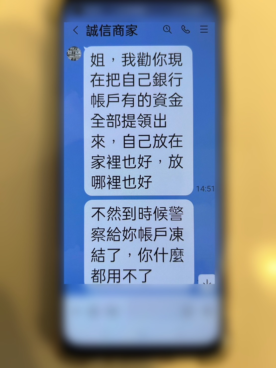 海安派出所副所長王志宏、警員林煒峻獲報後立即趕赴現場,耐心詢問後得知,徐女日前透過一名自稱「住在離島的老鄉」聯繫,對方以「虛擬貨幣USDT投資」為由,聲稱該項目「穩賺不賠、報酬極高」。之後,又有一個LINE暱稱「誠信商家」的帳號持續勸說,稱若不盡速將帳戶資金全數提領投入,帳戶將遭「凍結」或「資金失效」,導致徐女一度信以為真,急忙前往銀行提領大筆現金。