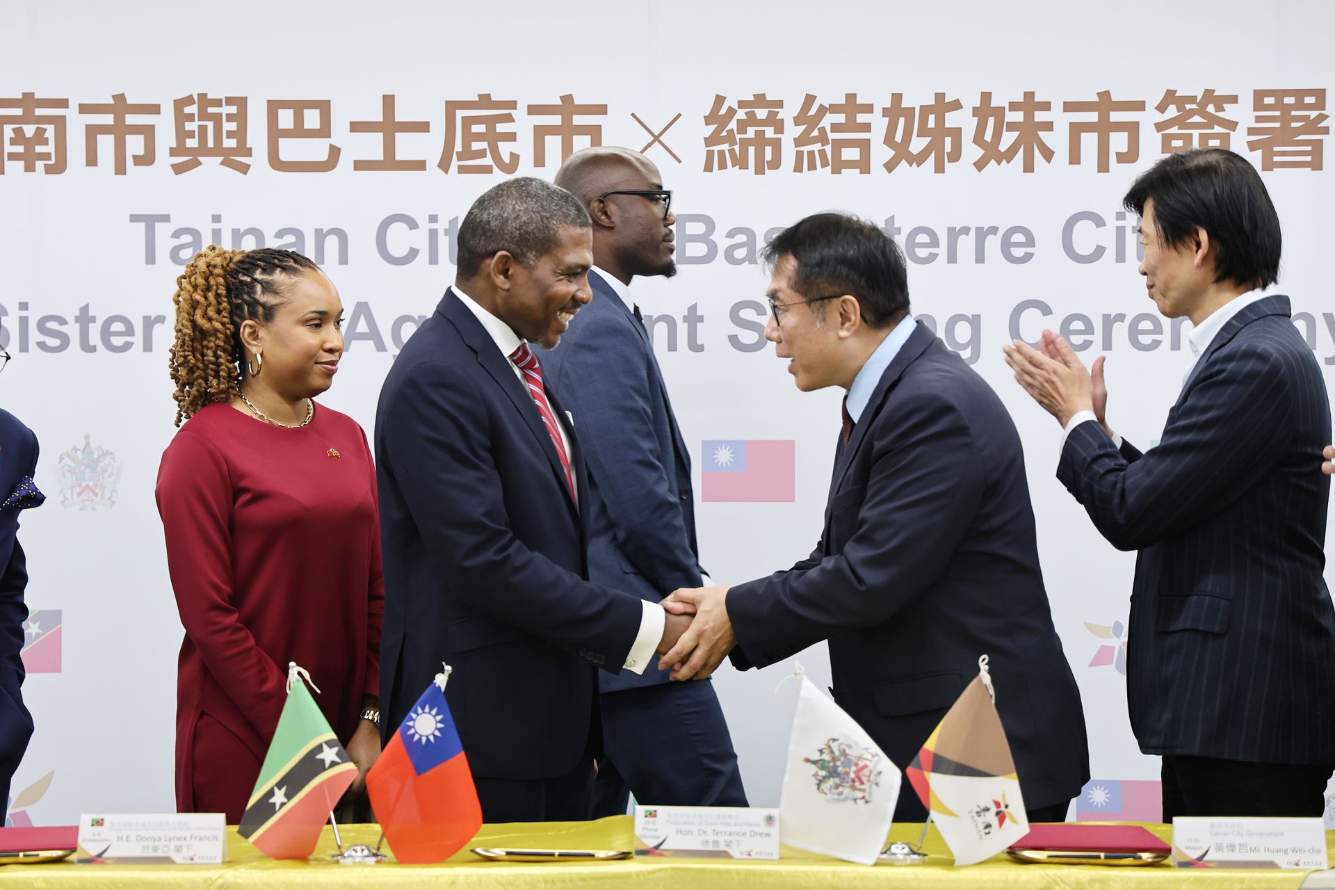 邦交國聖克里斯多福及尼維斯聯邦總理德魯(Terrance Drew)於(14)日與總理夫人普琳絲(Diani Prince-Drew)率團到訪台南,黃偉哲市長偕葉澤山副市長與多位市府局處首長熱情迎接訪團。德魯總理此行見證了該國駐台大使范東亞(H.E. Donya Lynex Francis)代表巴士底市(Basseterre City)與黃偉哲市長簽署姊妹市協定。