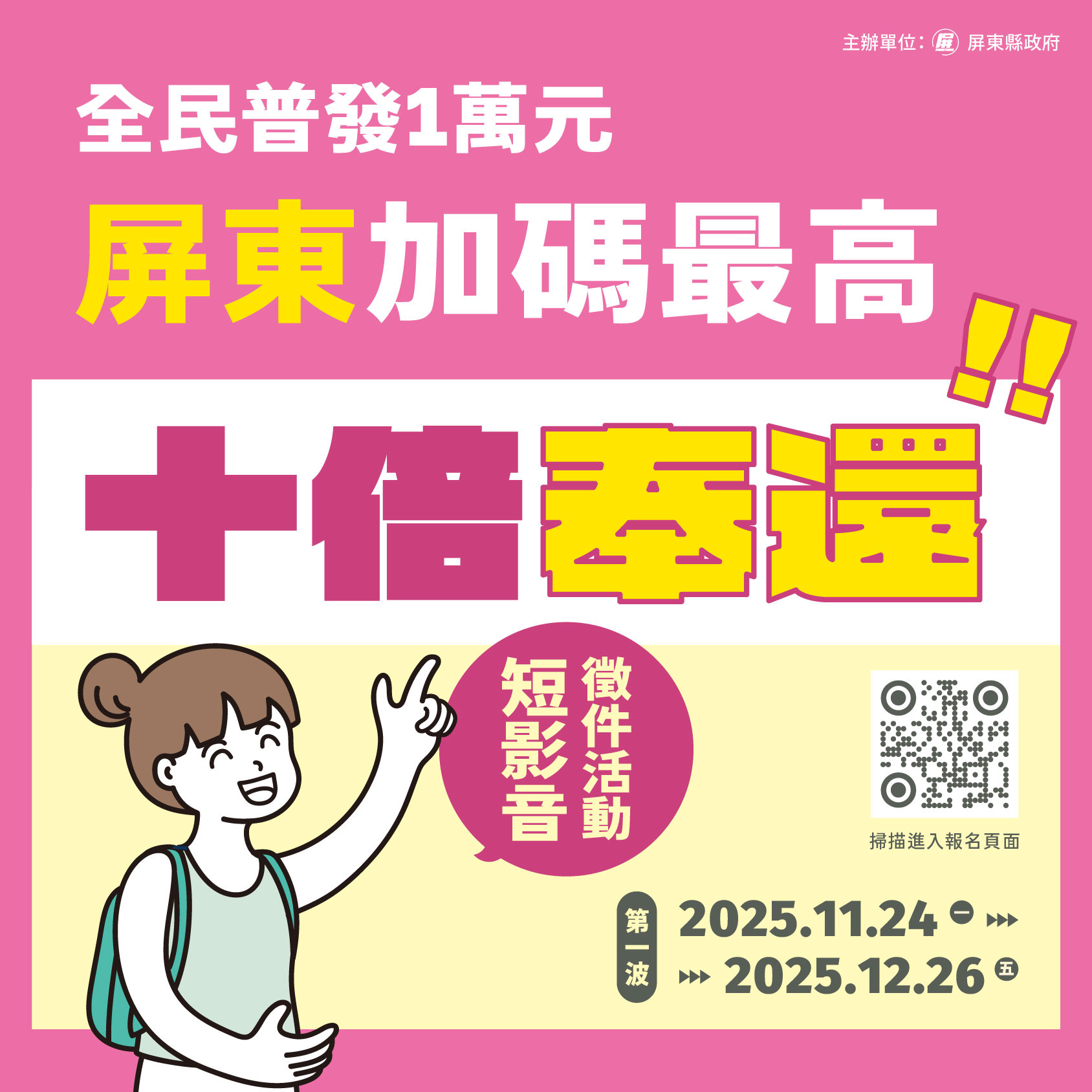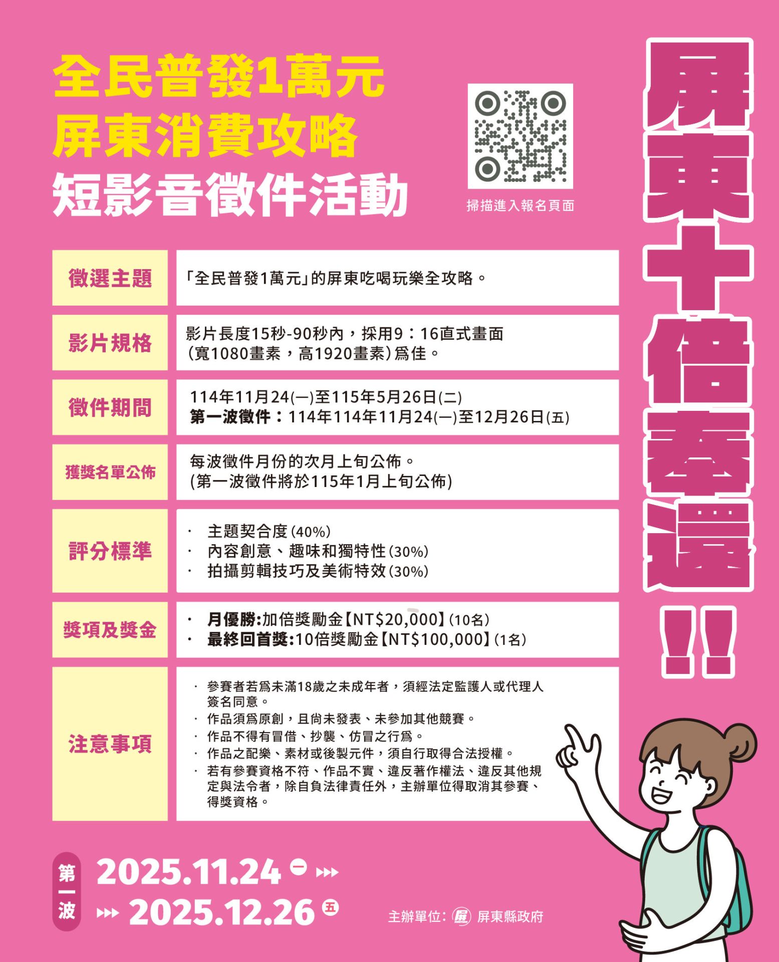全民普發1萬元政策正式上路,屏東縣政府為擴大普發效益、活絡地方經濟與觀光產業,推出「普發1萬元・來屏東吃喝玩樂怎麼Shopping才對味」短影音徵件活動,邀請全台民眾發揮創意,用鏡頭拍出專屬於屏東的「消費攻略」。只要帶著1萬元到屏東吃喝玩樂,記錄下旅程與消費路線,即可參加徵件,有機會抱走高額獎金。