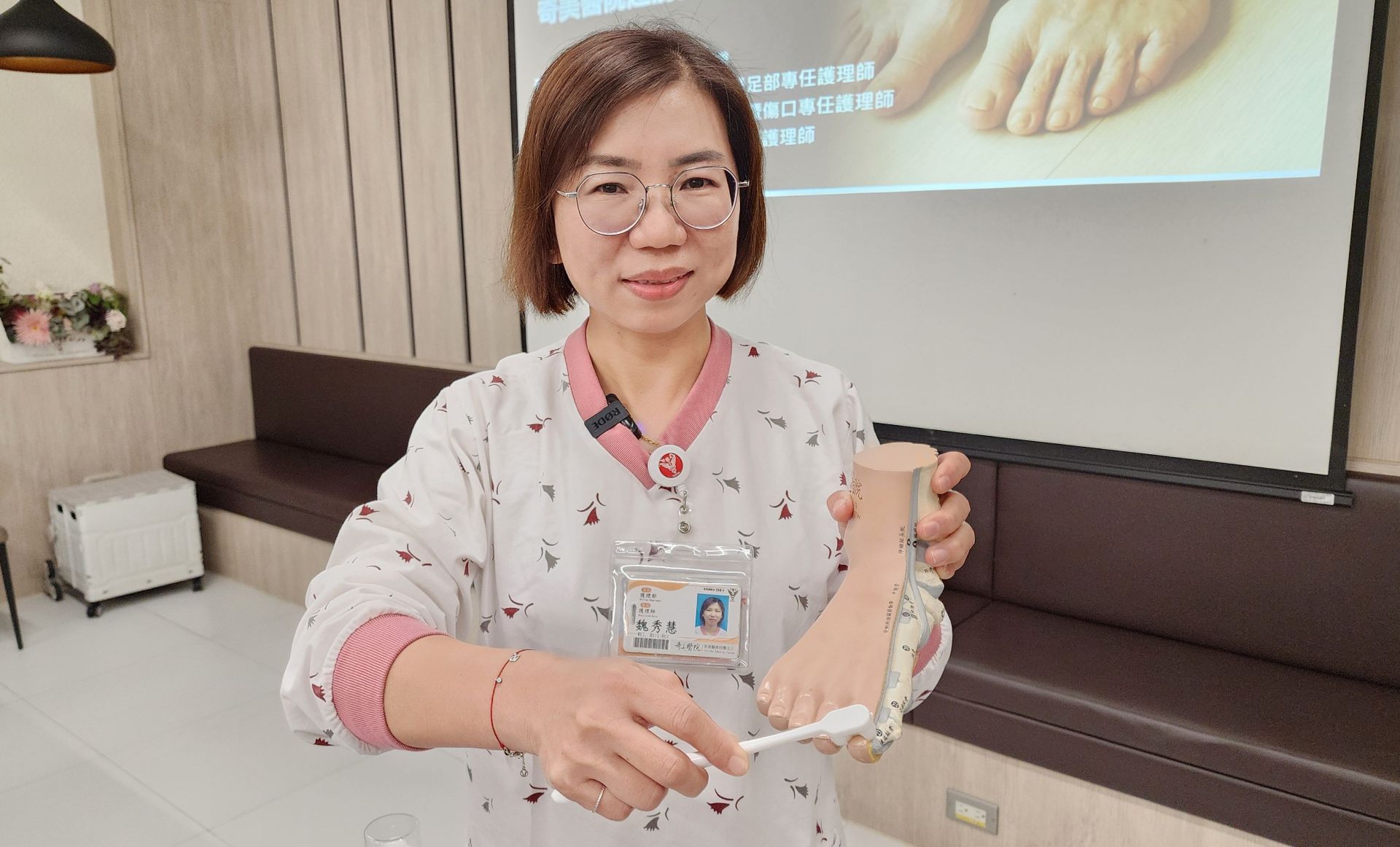 護理部傷口暨足部護理師魏秀慧,親自示範長者足部日常清潔的正確步驟,呼籲家屬或長者每日檢查並落實基礎保養