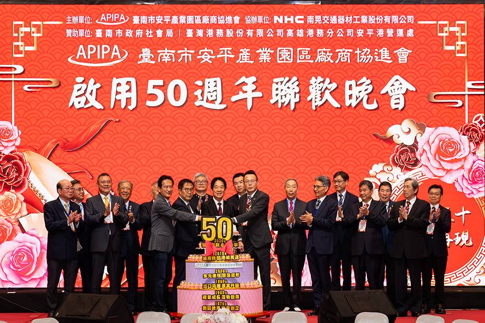 安平產業園區啟用 50 週年慶典主題儀式,由賴清德總統、臺南市長黃偉哲及安平產業園區廠商協進會理事長鄭丞焜,聯同貴賓共同擎啟六層紀念蛋糕,祝賀「安平 50.榮耀啟動」。圖/彪網媒 翻攝