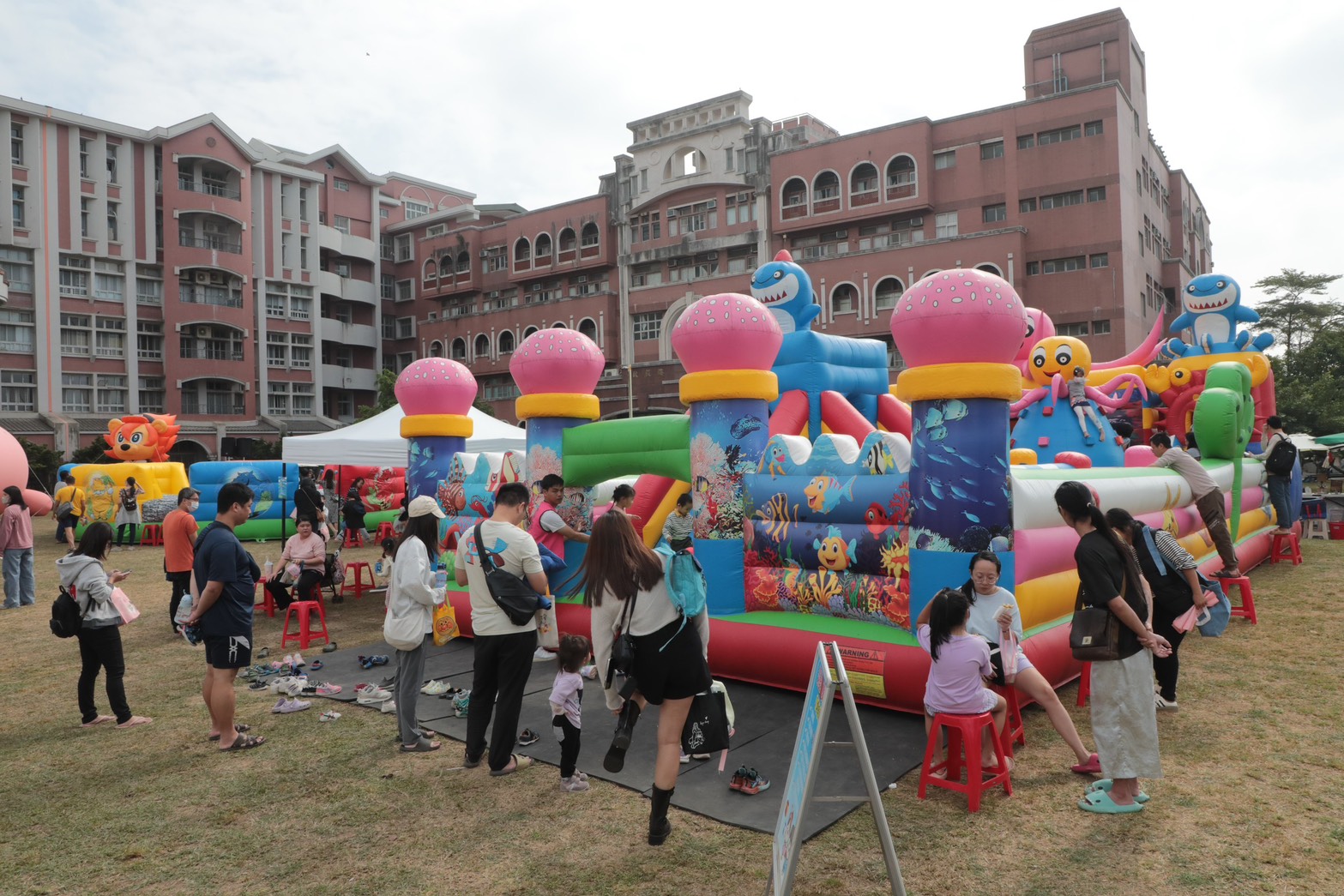 現場設置5座大型氣偶,包括泡湯版魚頭君、菜奇鴨、卡比胖拉、巷仔Niau與元氣萊恩,另備有兩座大型遊戲氣墊,吸引親子排隊放電拍照。