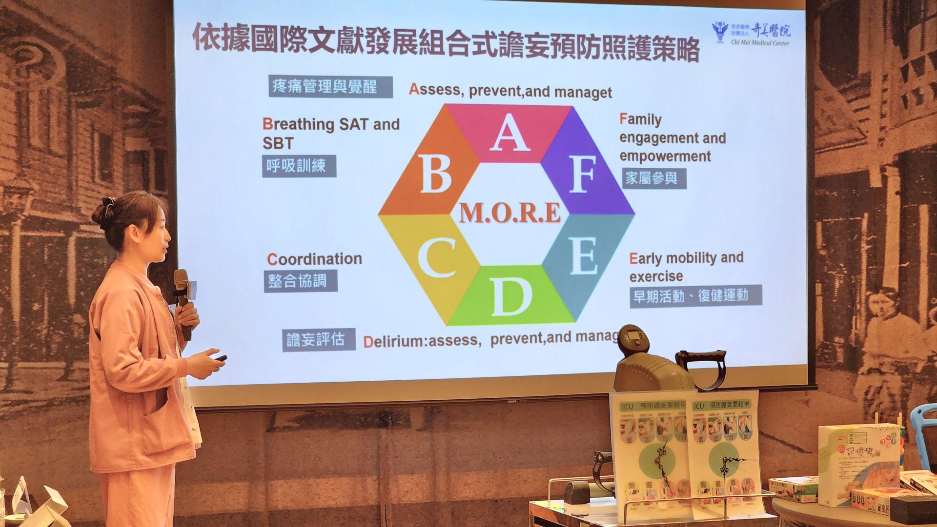 奇美醫療財團法人奇美醫院護理部3B加護病房護理長郭惠婷表示,「譫妄組合式照護策略M.O.R.E.A2F」全面升級,從音樂、睡眠到感官支持皆量身設計