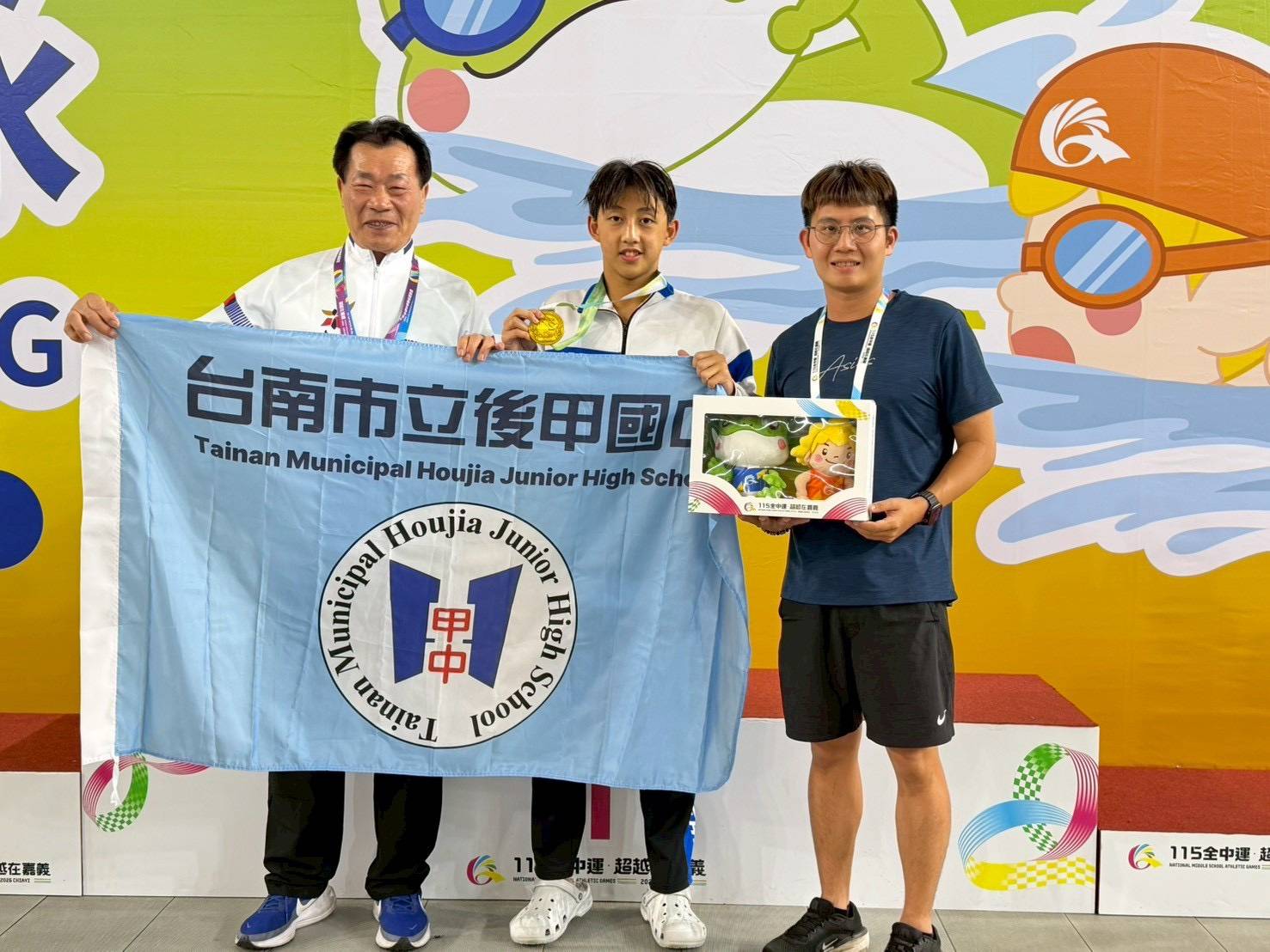 後甲國中 薛人豪 國男組50公尺仰式金牌與局長及教練合影